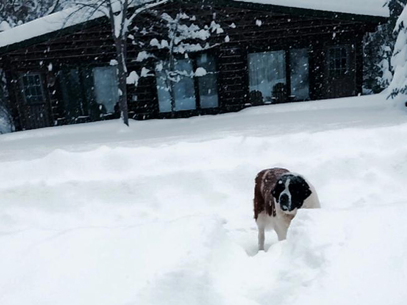 One might ask what the lodge dogs do to get through the winter months? Well Roni, everyone’s favorite chocolate lob is teaching Loop, Laine and Nikki’s puppy, all the tricks in the book. These two more often than not can be found lounging in the office or playing outside in the fresh snow. Dally and Daisy, the Saint Bernards are loving winter. Despite their interest in being inside dogs, these two always find the last snow patches to lay on when the weather warms up. Don’t worry though, they will all get fresh baths before everyone gets here.